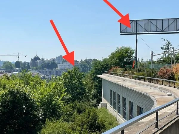 I was reminded of that today when I stood on the roof of that hotel and looked in the direction of the university. I marked the points of university and hotel with red arrows.